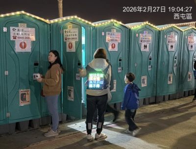 2026中台灣燈會璀璨展現國際知名 IP「姆明一族(The Moomins)」與北歐極光奇幻相遇的燈光盛宴,賞燈人潮突破新高,為滿足燈會期間民眾如廁需求,台中市政府環保局在燈區周邊人流動線聚集處共增設51座單座式流動廁所和5台流動廁所車,每處均至少配置3名以上駐點人員加強廁間清潔維護頻率及主動引導民眾使用流廁設施,確保民眾如廁品質。